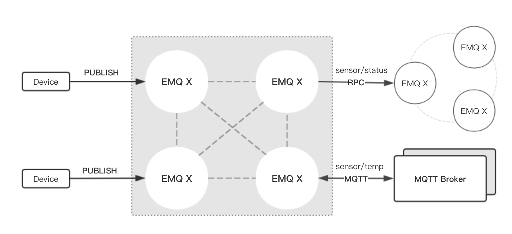 2. RPC bridge can only bridge two EMQX broker together and cannot bridge EMQX broker to other MQTT brokers.